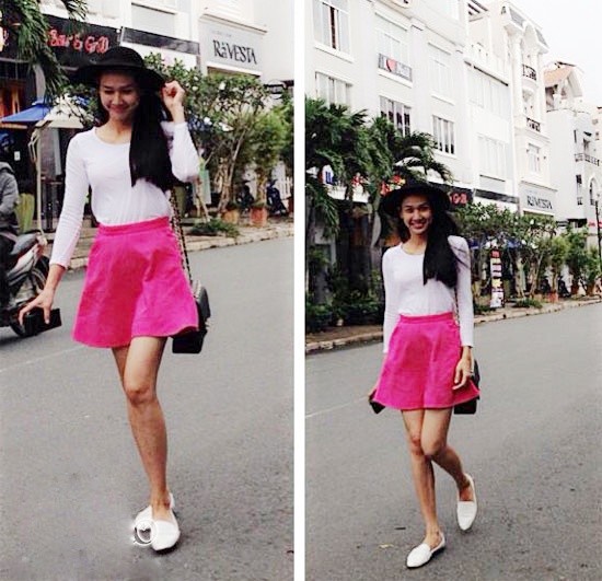 | Dương Mỹ Linh mix áo thun dài tay và váy xòe hồng đáng yêu. |