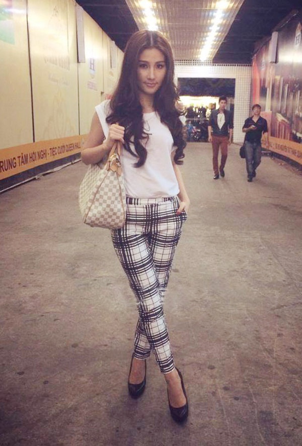 | Diễm My 9x khoe vẻ năng động với áo thun trắng và quần kẻ. |
