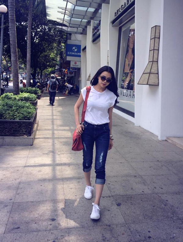| Chiếc áo cũng được Trà Ngọc Hằng mix rất khỏe khoắn với quần denim và giày thể thao. |