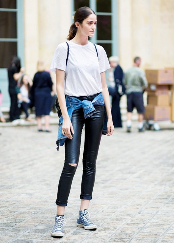 | Áo thun trắng cổ điển mix kèm quần da và giày vải khỏe khoắn. |