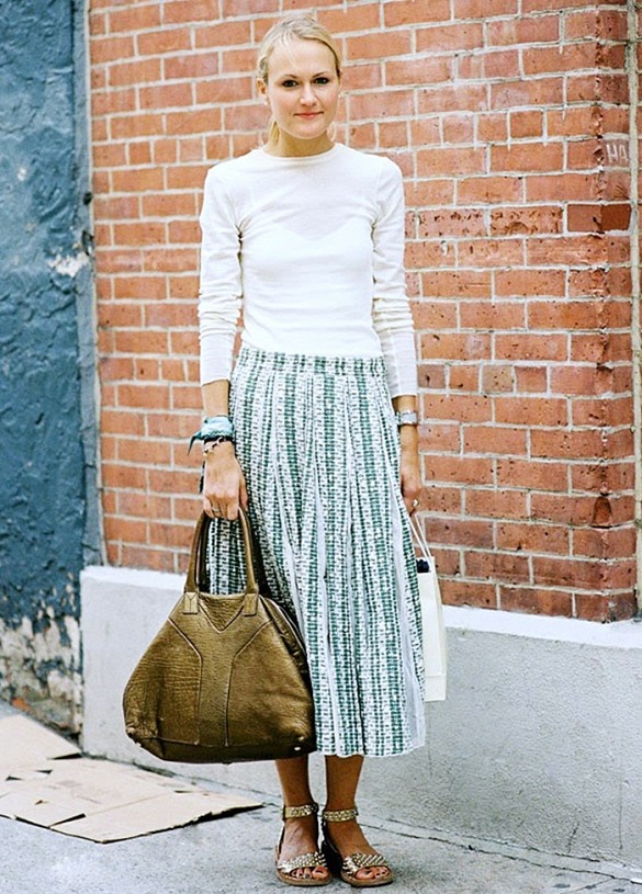 | Áo thun dài tay xuống phố dịu dàng với váy midi. |