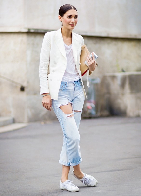 | Áo thun giấy năng động mix kèm blazer và giày vải khi xuống phố. |