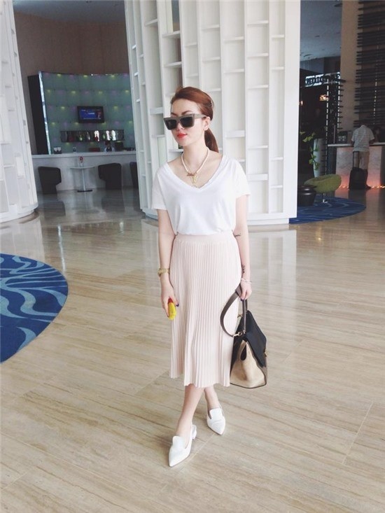 | Than Hằng khoe vẻ duyên dáng với áo thun cổ khoét sâu và váy midi. |