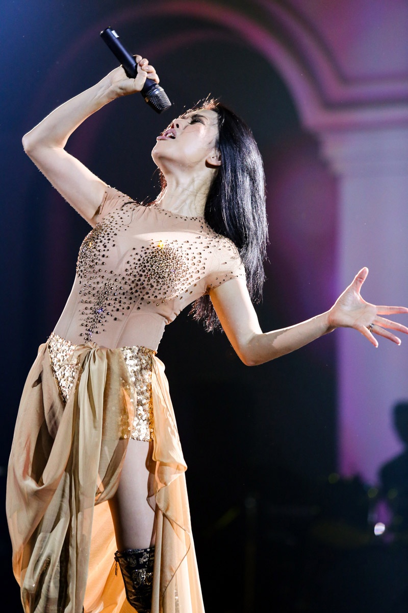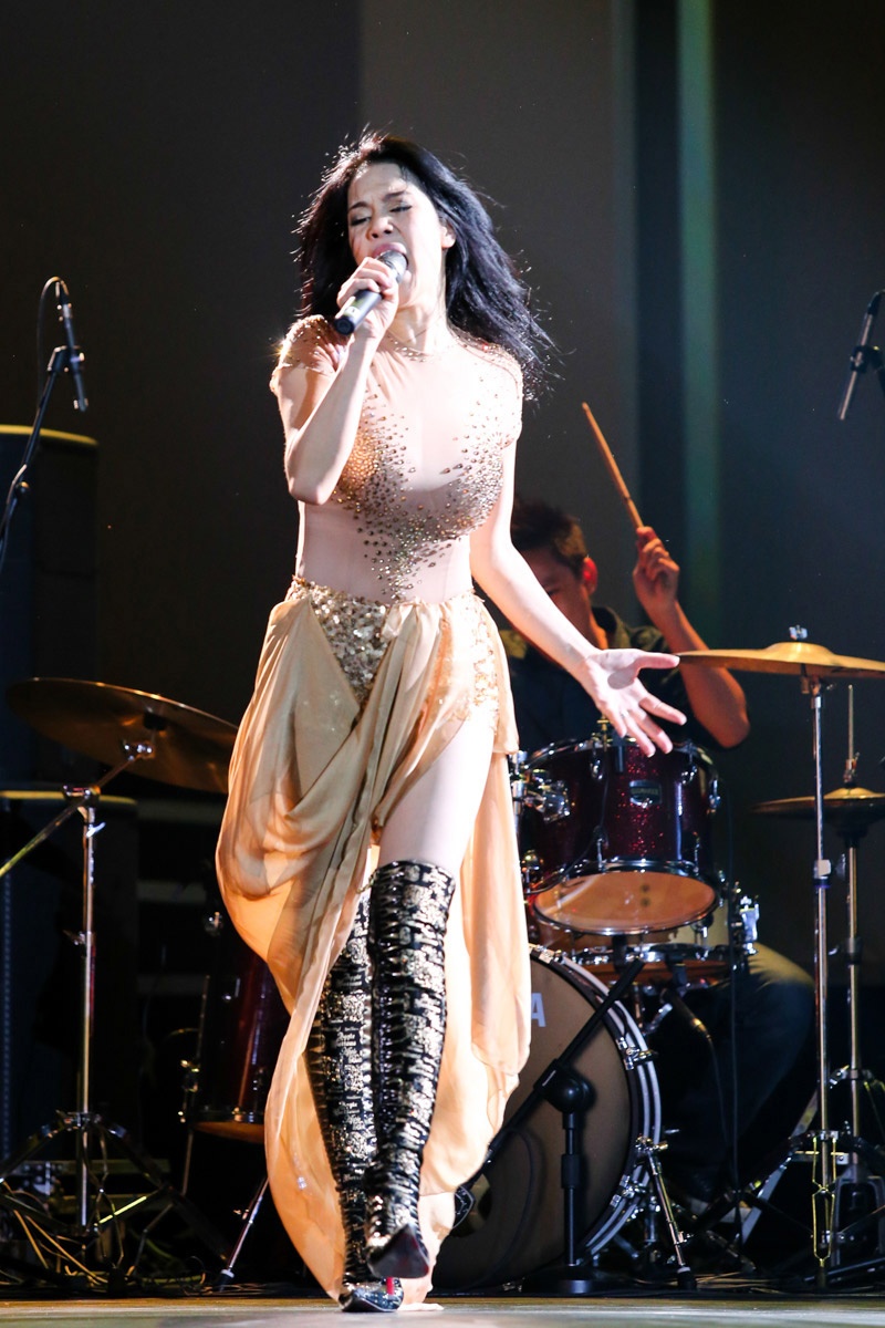 | Không chỉ khoe vóc dáng mảnh mai ở những chiếc đầm dạ hội mềm mại, Thu Phương khi bốc lửa với những ca khúc sôi động cũng đầy mê hoặc người đối diện. |