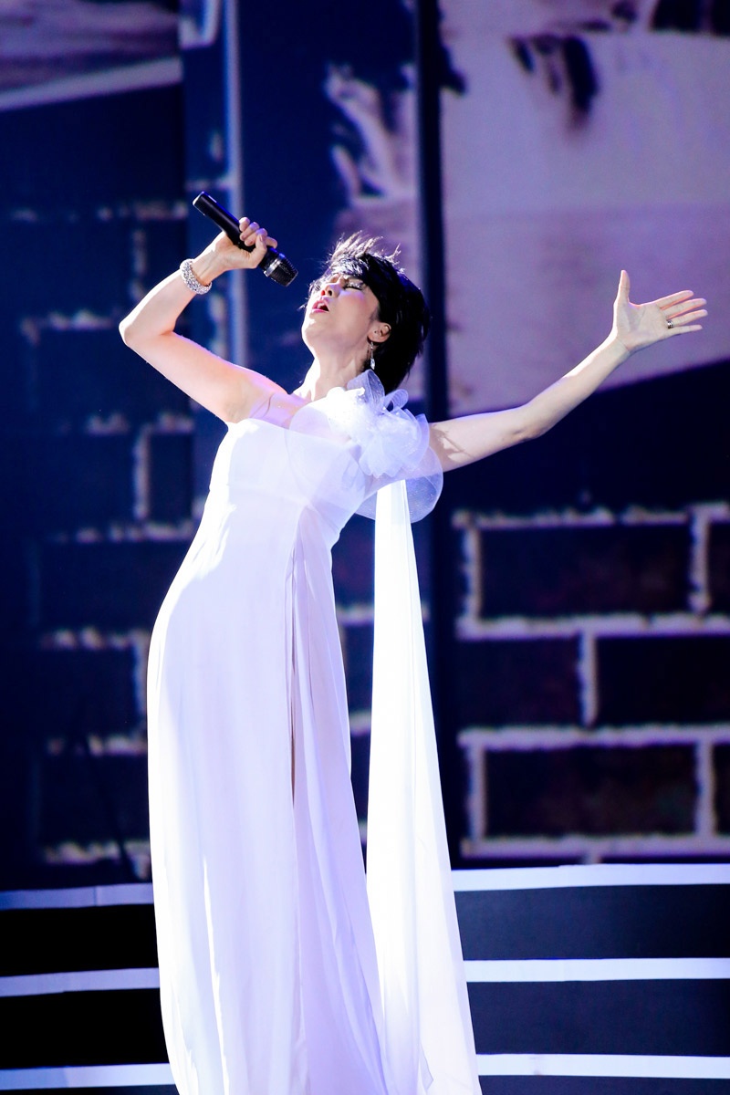 Trang phục bay bổng hơn với dải lụa phía cầu vai kéo dài chấm đất. Hình ảnh Thu Phương thêm phần tinh tế khi cô chuyển giọng lên cao hay khi thăng hoa cùng ca khúc.