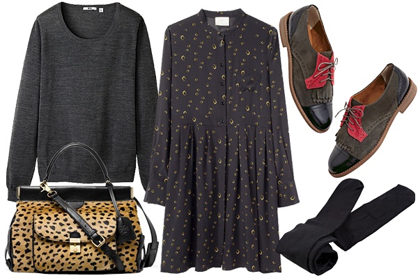 Những cô nàng cá tính không thể bỏ qua cách mix váy xòe liền thân với kiểu áo len dáng thụng. Quần tất mỏng và giày oxdord mang lại ấm áp, nhưng vẫn trẻ trung cho bạn gái. |