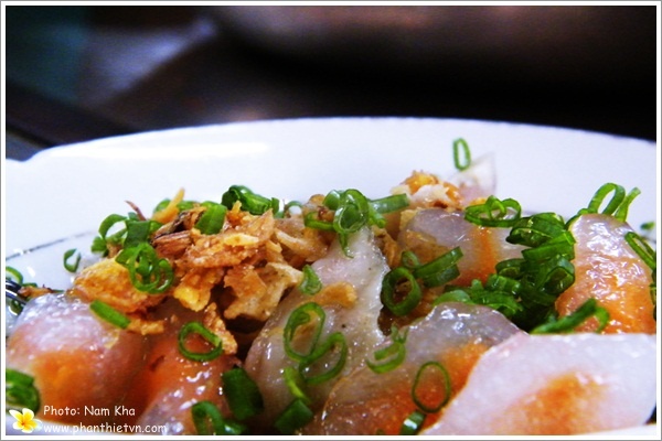 Bánh quai vạc Mũi Né thoạt trông khá giống bánh bột lọc Huế, song nhỏ hơn, vỏ bánh cũng có màu đục hơn, phần nhân cũng làm từ thịt ba chỉ và tôm xào chín. Bánh quai vạc ăn cùng nước mắm pha chua ngọt vị cay, hành phi và tóp mỡ. Ảnh: Kevin.