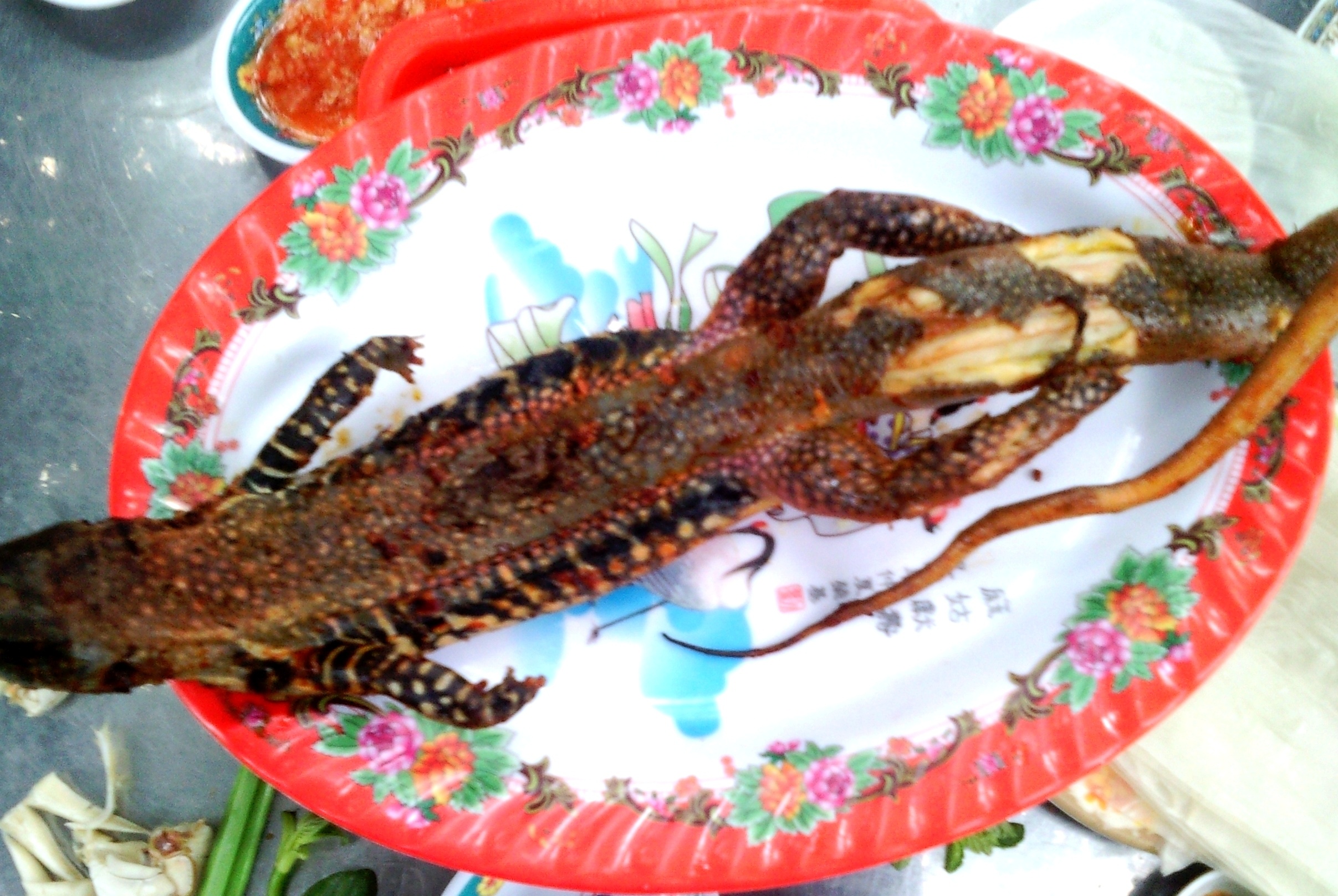 Người ta có thể chế biến dông thành 7 món gồm nướng, rô ti, hấp, chả, gỏi, cháo và nấu dưa hồng. Mỗi món có đặc sắc riêng. Ngon nhất là dông nướng. Tuy nhiên, món ăn này thường nướng nguyên con nên chỉ những ai can đảm mới có thể thưởng thức. Ảnh: Otofun.