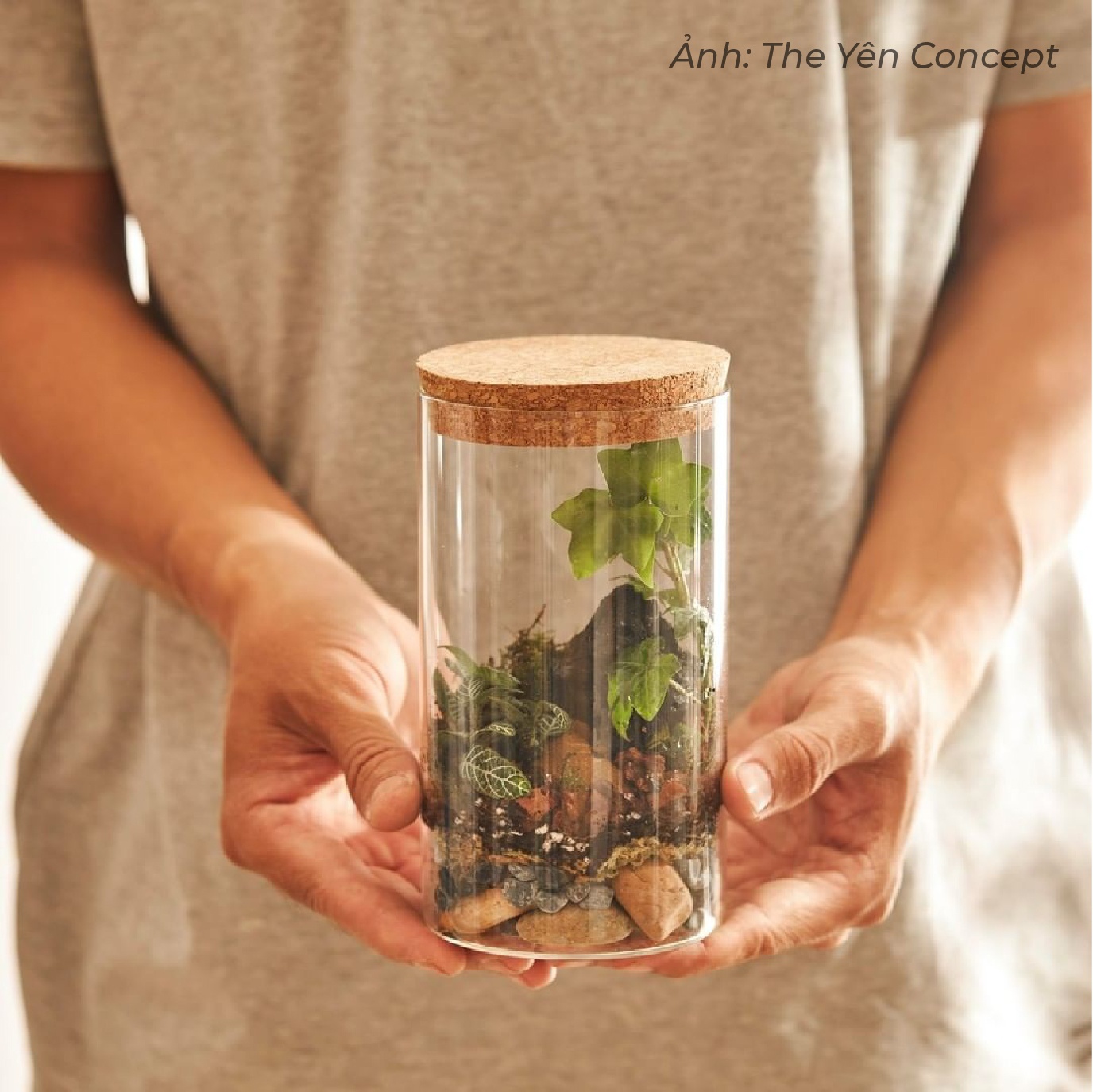 Điểm tôi thích là tiệm có những bộ kit DIY, bạn có thể mua và tự tạo nên một chậu cây theo phong cách của mình. Mỗi bộ kit của có giá 300.000 đồng với đầy đủ cây xanh, rêu khô, đất, sỏi và bình trụ.