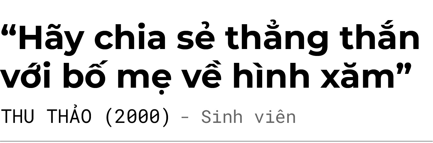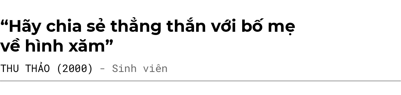 “Chiến tranh lạnh” cả một thời gian dài, tôi mở lời với bố trước để giải thích về hình xăm này. Bố tôi không cáu gắt nữa, chỉ nói rằng: Bố sợ người ngoài khi nhìn thấy sẽ đánh giá con gái là người không đàng hoàng. Sau khi tôi giải thích, bố cũng dần nguôi ngoai.