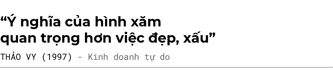 Tôi có hình xăm đầu tiên khi chia tay bạn trai cũ. Trong cơn đau khổ, tôi muốn thử một chuyện từ trước giờ mình chưa từng làm - xăm hình. Cảm giác kim đâm trên da khiến tôi dễ chịu hơn phần nào. Từ đó về sau, mỗi khi có chuyện, kể cả vui hay buồn tôi đều xăm thêm một hình để kỷ niệm.