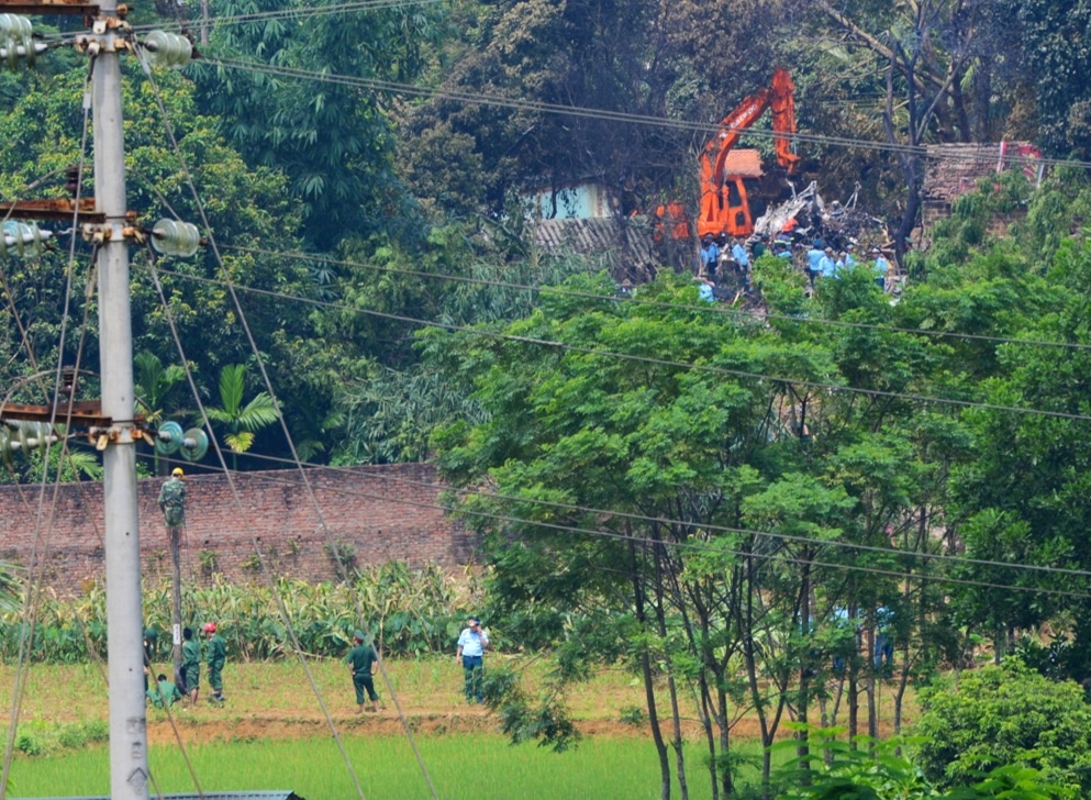 | Cận cảnh hiện trường chiếc trực thăng Mi-171 mang số hiệu 01 của Trung đoàn Không quân trực thăng 916, Sư đoàn Không quân 371, thuộc Quân chủng Phòng không - Không quân bị rơi sáng 7/7. |