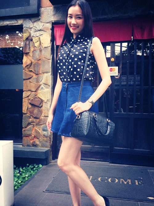 Trúc Diễm xinh đẹp với áo sơ mi họa tiết chấm bi mix kèm chân váy denim.