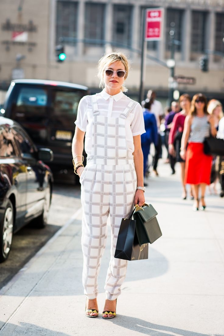 Bộ trang phục yếm cũng có thể trở thành thời trang công sở với họa tiết carô nền nã.