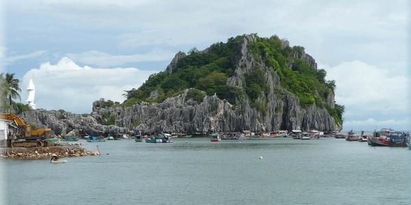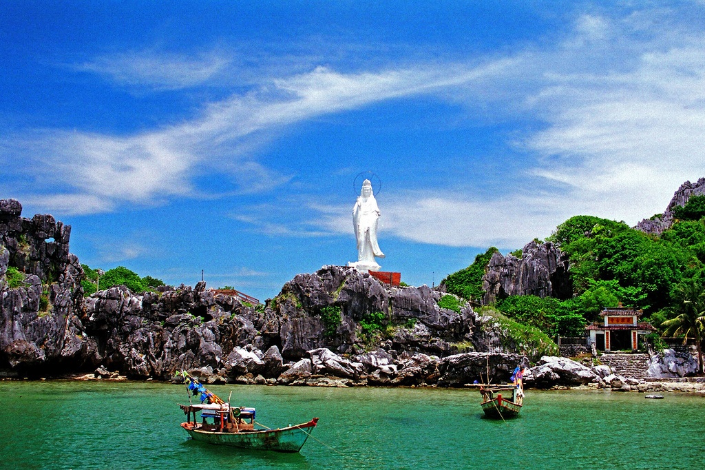 Đảo Hòn Nghệ hấp dẫn du khách với những bãi biển hoang sơ, hệ thống bè nuôi cá cùng không khí mát mẻ. Điểm tham quan nổi bật nhất tại đảo là núi Lầu Chuông, nơi có bức tượng Phật Bà khổng lồ, hệ thống hang động kỳ vĩ... Các món ăn đáng thử tại đây gồm chả trứng cá ngát, tôm tích luộc, ốc nướng chao, vọp mỡ hành... Ảnh: Vietnamtourism. |