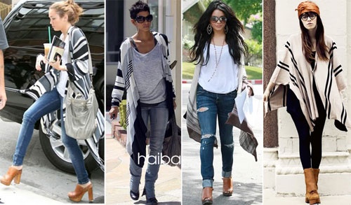 Đây là kiểu áo khoác được biến tấu từ chiếc khăn mỏng hoặc có kiểu dáng giống như một chiếc khăn. Hồ Ngọc Hà đã sử dụng một chiếc khăn to bản cùng với sự hỗ trợ của thắt lưng để tạo nên mảnh áo khoác rất thời trang.