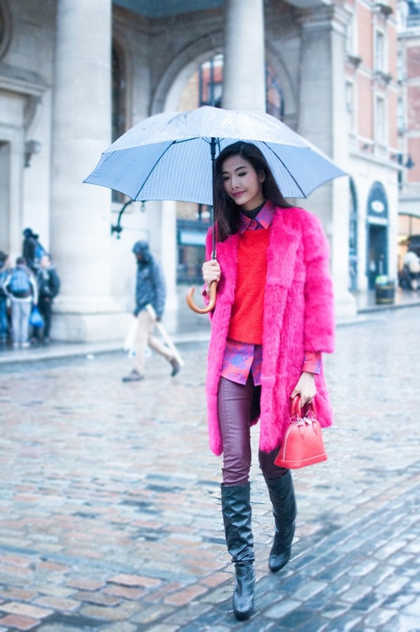 Hoàng Thùy nổi bật với áo khoác lông hồng rực rỡ trên phố.
