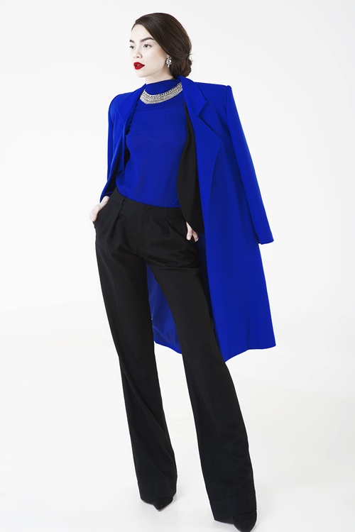 Hà Hồ gây ấn tượng với cách mix áo xanh royal cùng áo khoác đồng màu sành điệu.