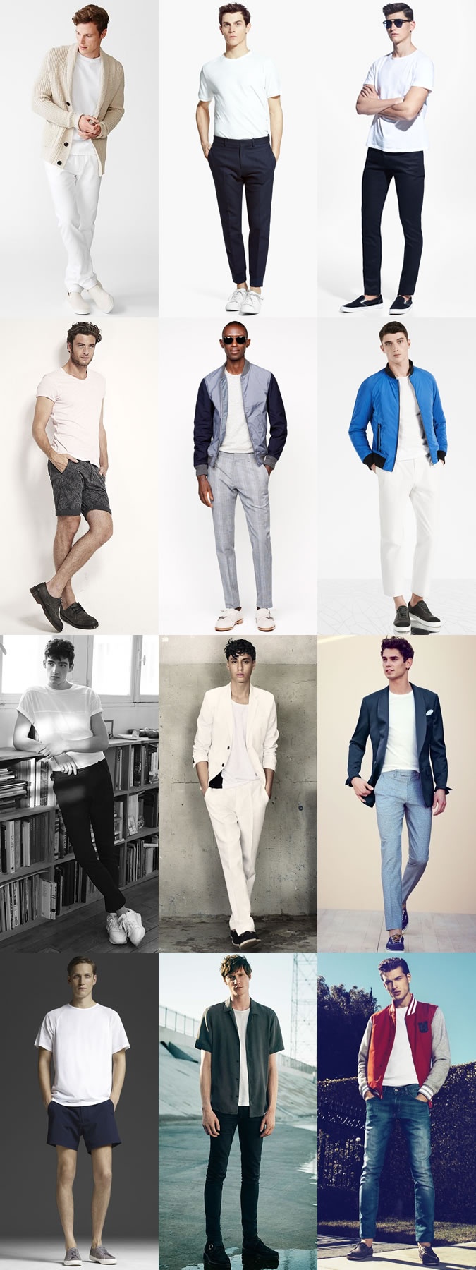 | Được người nổi tiếng như James Dean, David Beckham, Marlon Brando hay Ryan Gosling yêu thích, áo phông trắng cổ tròn là item không thể thiếu trong tủ đồ của bất cứ chàng trai nào. Chiếc áo này phù hợp nhất khi phối cùng jeans và áo khoác da, bên cạnh đó áo trắng cũng có thể kết hợp được với phần lớn mọi trang phục khác. |