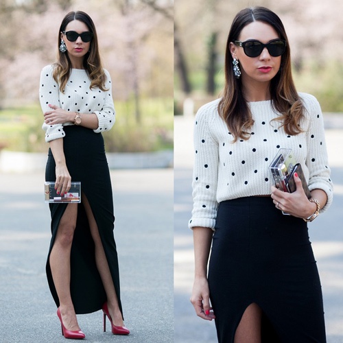 | Áo len chấm bi mix khéo léo cùng chân váy xẻ cho phong cách tiệc tùng. |