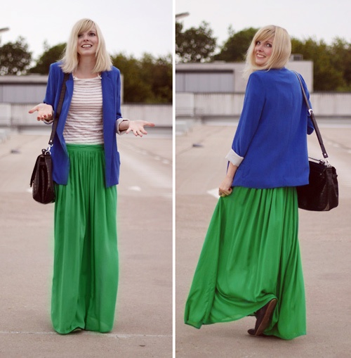 Balzer xanh royal mix kèm áo thun kẻ và maxi xanh lá cho cô nàng năng động.
