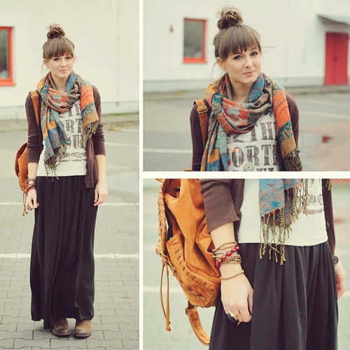 Nếu lựa chọn phong cách này, bạn cần lưu ý tới việc phối họa tiết hay màu sắc. Sẽ chỉ maxi hoặc áo len có in hoa văn, tương tự, nếu áo len đậm thì maxi nên là màu nhạt và ngược lại.