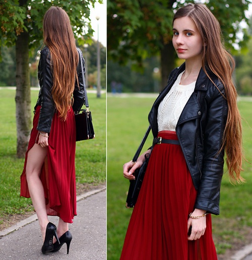 Sự kết hợp thoạt tiên nghe có vẻ khó gần nhưng chính sự đối lập giữa áo da nổi loạn, mạnh mẽ và chiếc chân váy maxi mềm mại lại tạo nên một hình ảnh rất hấp dẫn cho cô gái hiện đại.