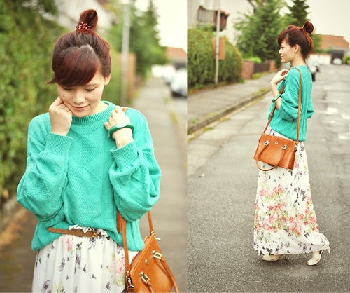 Phong cách xuống phố đáng yêu với áo len dáng rộng và maxi hoa voan.