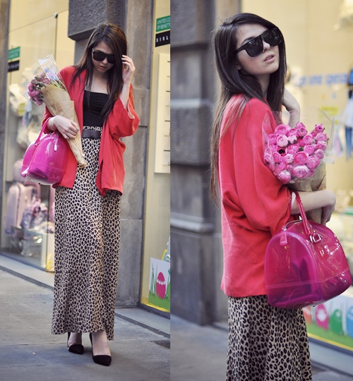 Váy maxi da báo cho cô nàng ưa sự nổi bật khi mix kèm blazer đỏ.