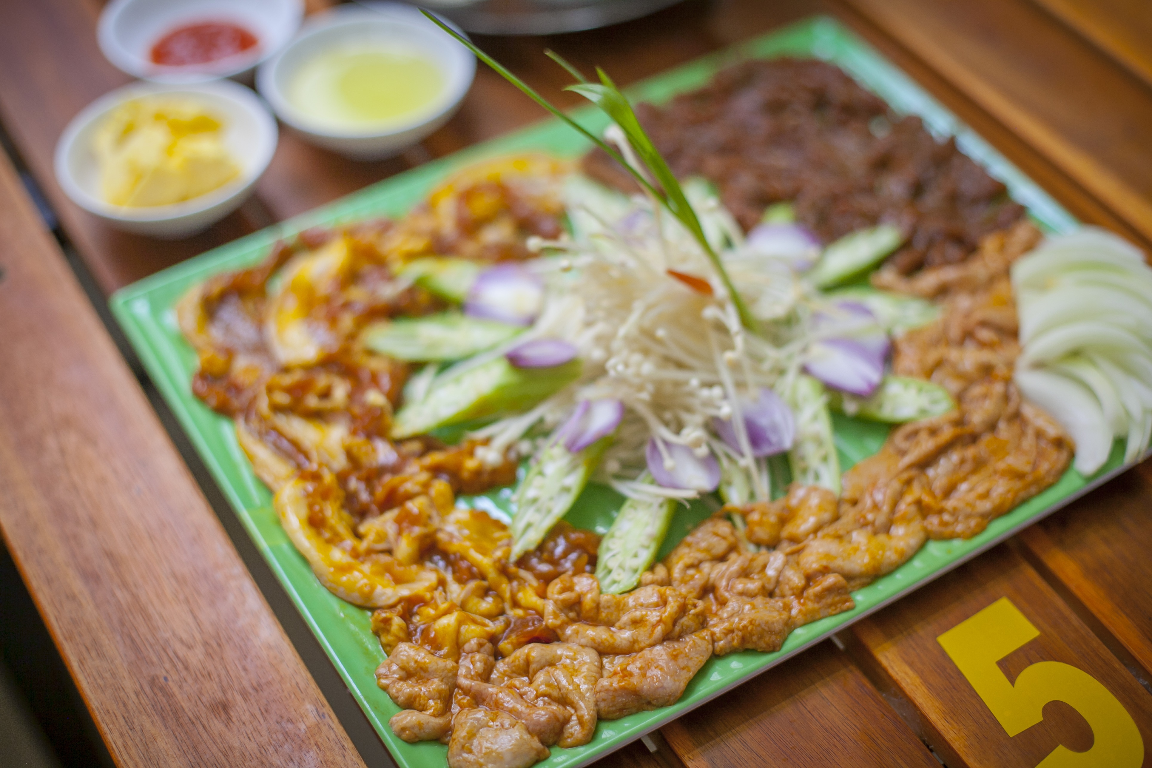 Một phần bò nầm nướng phong phú với nầm, bắp bò, ba chỉ, nấm kim chi, đậu bắp… Sau khi nướng chín, chấm từng miếng thịt còn nóng hổi vào tương ớt, cắn nhẹ. Chỉ như thế, mùi đặc trưng của nầm sẽ được gia vị, bơ, tương ớt "gói" vào bên bên khiến thực khách như đang thưởng thức vị ngon của nhũ.