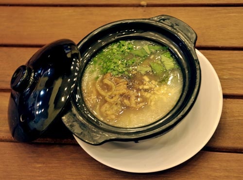 Tô cháo mực đơn giản với vài miếng mực khô xé, giá, huyết, da heo, gừng tươi... Món ăn này thu hút ở vị thơm của gừng hòa với trong vị cay nồng của tiêu, dai mềm của mực, dai giòn của da heo.