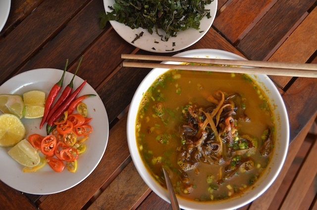 | Công thức chế biến đơn giản, song để có một tô cháo lươn ngon đòi hỏi khá nhiều kỹ thuật của người nấu trong việc sơ chế lươn, canh lửa khi hầm và tỷ lệ gia vị khi xào. Đảo nhẹ tô cháo, phần lươn xào sẽ quyện vào, tạo nên sắc vàng bắt mắt. Ngoài cháo lươn, miến lươn cũng là món ăn được lựa chọn nhiều nhất khi đến vùng đất này. Ảnh: Thedropoutdiaries. |