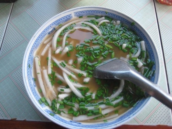 | Cháo bột Hải Lăng (Quảng Trị) có cách chế biến cầu kỳ. Gạo ngon ngâm nước được xay thành bột, ép ráo, nhào mịn, xắt lát. Thịt cá lóc xào thơm, hầm xương lấy nước, nêm nếm gia vị thành nước dùng. Ảnh: Balonguoc. |
