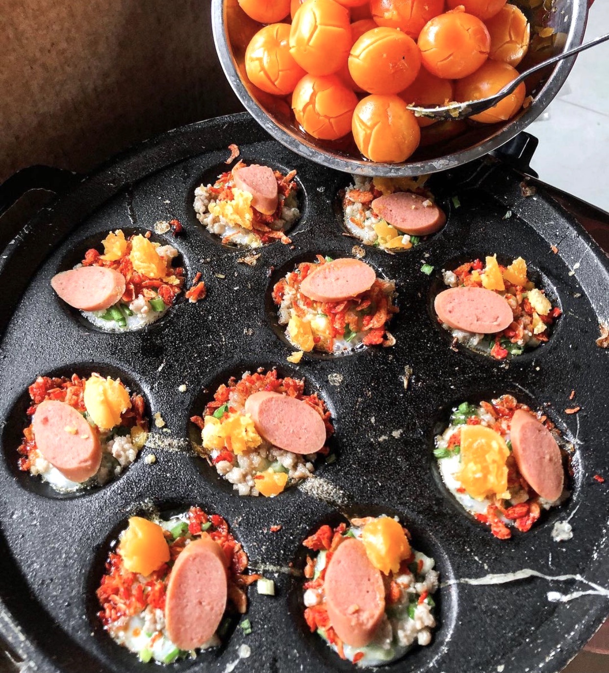 Bánh trứng cút là món ăn đáng thử nếu bạn có dịp đến khu chợ ẩm thực Hồ Thị Kỷ. Ruốc, thịt bằm, chà bông, xúc xích, hành lá và trứng muối cũng được kết hợp làm tăng sự hấp dẫn. Thực khách ăn bánh kèm tương cà, tương ớt hoặc sốt mayonnaise. Ảnh: Citastyfood. |