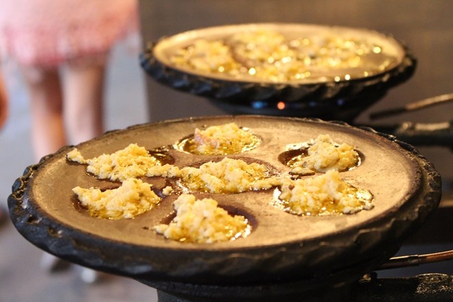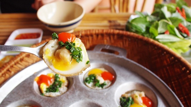 Sò điệp nướng trứng cút: Sau khi tách lớp vỏ sò, đầu bếp thêm quả trứng cút lên trên rồi nướng trên bếp than. Khi sò điệp và trứng cút gần chín tới, quét lên một ít mỡ hành cho món ăn dậy mùi. Ngoài vị thơm ngon, món ăn này cũng mê hoặc thực khách với tạo hình của một đóa hoa. Ảnh: Linh San.