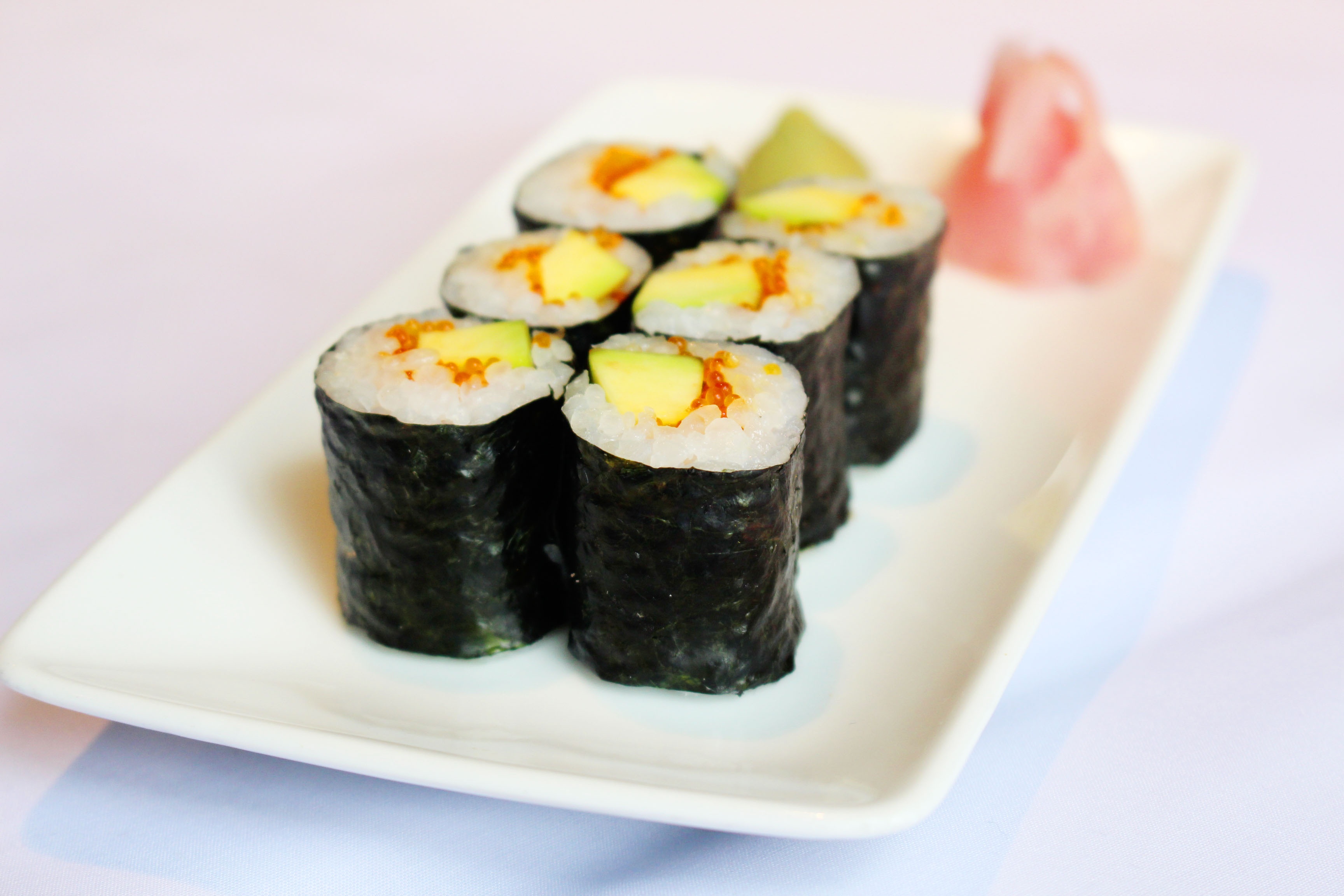 1. Sushi Tobiko Avocado Maki - 2 lá rong biển, 1 trái bơ chín, 50 gram trứng cá hồi, 1 chén cơm, 20 ml giấm gạo, 1 muỗng cà phê đường. - Trộn cơm với giấm gạo và đường. Trải đều cơm trộn lên miếng rong biển, cho thanh bơ cắt dọc và trứng cá vào giữa. Dùng dụng cụ cuốn lại. Cắt cuộn sushi thành từng khúc ngắn. |