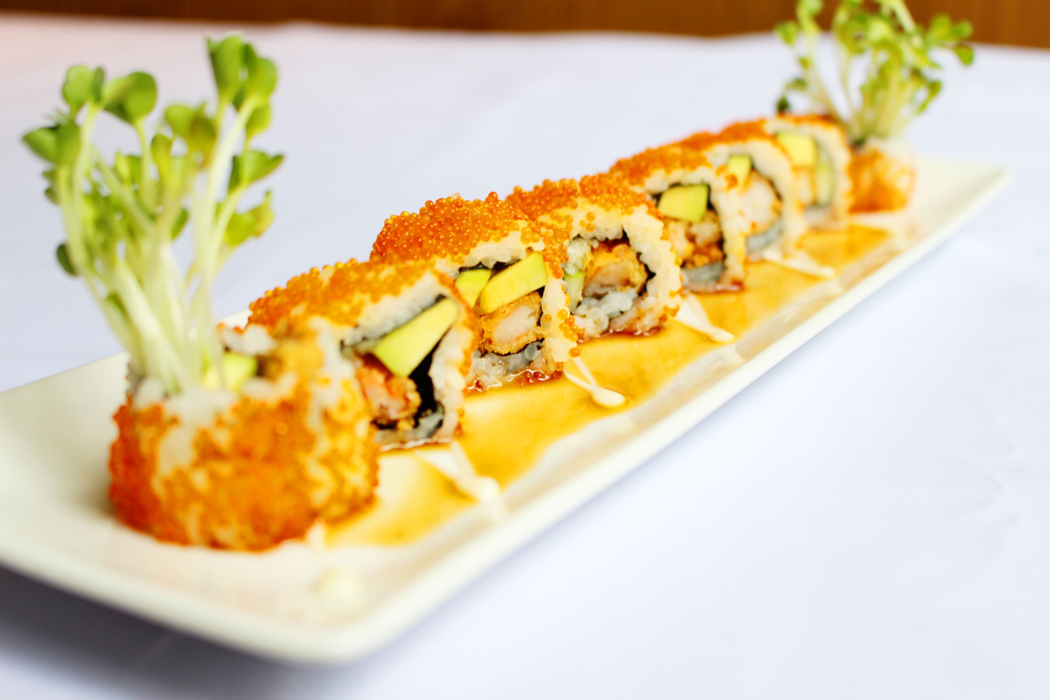 5. Sushi Tobi Ebi Avocado Roll - 2 lá rong biển; 1 trái bơ; 20 gr trứng cá chuồn; 50 gr thăn heo; 1 trái dưa leo; 50 gr bột bắp; 50 gr bột chiên xù; 1 cái trứng gà; 1 chén cơm và 20 ml giấm gạo. - Thăn heo cắt miếng dài 10 cm có độ dày 1 cm. Ướp thăn heo với muối, sau nhúng vào bột bắp, nhúng tiếp qua hột gà, rồi nhúng vào bột xù và chiên trong dầu chín vàng giòn. Bơ và dưa leo cắt thanh dài 10 cm và có đường kính 1 cm. + Dàn đều cơm trộn lên miếng rong biển. Sau đó lật ngược lá rong biển lại, đặt thanh dưa leo, thanh bơ và thịt thăn heo dài theo theo lá rong biển, cuộn lại. Cắt thanh sushi thành những miếng nhỏ vừa ăn. Ảnh: YummyQ. |