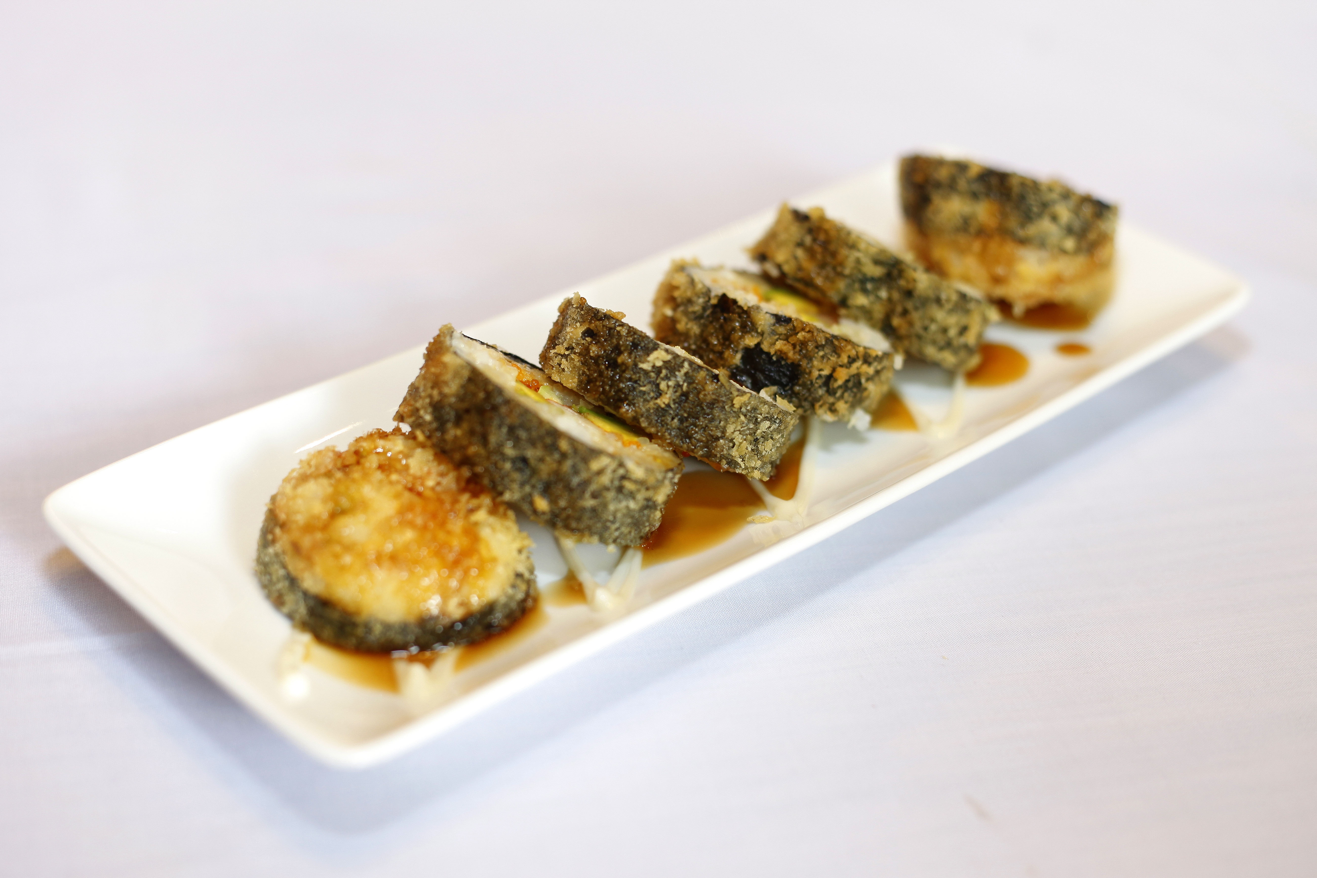 3. Sushi Futo Maki Crunch: - 2 lá rong biển; 1 trái bơ; 20 gr trứng cá chuồn; 50 gr tôm sú; 1 trái dưa leo; 1 thanh cua; 50 gr bột bắp; 1 cái trứng gà; 100 gr bột xù; dầu ăn; 1 chén cơm và 20 ml giấm gạo. - Dưa leo/ bơ rửa sạch cắt thanh dài 10cm và có đường kính 1 cm. -Trải đều cơm (đã trộn giấm đường) lên 2/3 lá rong biển. Sau đó rải trứng cá chuồn lên bề mặt cơm, đặt tiếp bơ, dưa leo, thanh cua, cuộn lại. - Áo bột bắp đều mặt ngoài thanh sushi, sau đó nhúng vào trứng gà, tiếp theo lăn qua bột xù, cho vào chảo chiên giòn. Vớt ra, để ráo, cắt thành miếng vừa ăn. |