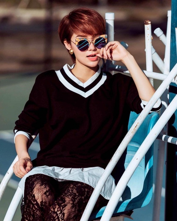 Tóc Tiên: Nếu Ngày mai được xem là bài hát "duyên nợ" đối với Tóc Tiên, giúp sự nghiệp âm nhạc của cô thăng hoa như diều gặp gió thì mái tóc tém cũng được coi như mối "duyên nợ", khiến hình ảnh của cô lột xác hoàn toàn. Kiểu tóc này phù hợp với cá tính mạnh mẽ của cô, đồng thời khiến cho độ quyến rũ tăng lên gấp bội. |