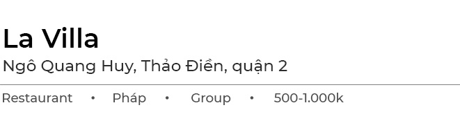 Với những đối tác nước ngoài kỹ tính, không hợp món Việt, La Villa là lựa chọn phù hợp cho bữa ăn fine dinning kiểu Pháp. Tọa lạc tại khu Thảo Điền, nhà hàng là một trong những nơi thưởng thức ẩm thực Pháp nổi tiếng tại TP.HCM.
