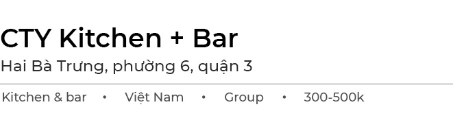 CTY Kitchen + Bar mang đến không gian dùng bữa hiện đại, thoải mái mà không suồng sã nhờ mô hình kết hợp nhà hàng và quầy pha chế. Khu vực ngồi ngoài trời được bố trí nhiều cây xanh, thiết kế tận dụng tối đa ánh sáng tự nhiên, tạo cảm giác thoáng đãng, thư giãn.