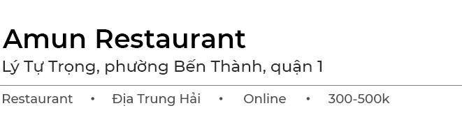 Các món tại Amun cũng phù hợp cho bữa tối sang trọng cùng gia đình. Bạn có thể gọi Amun beef short rib (sườn bò hầm rượu vang ăn kèm khoai tây nghiền), xiên cừu nướng than Địa Trung Hải hoặc xiên tổng hợp nướng than. Nhà hàng chỉ nhận đơn ship muộn nhất đến 22h30 các ngày trong tuần.