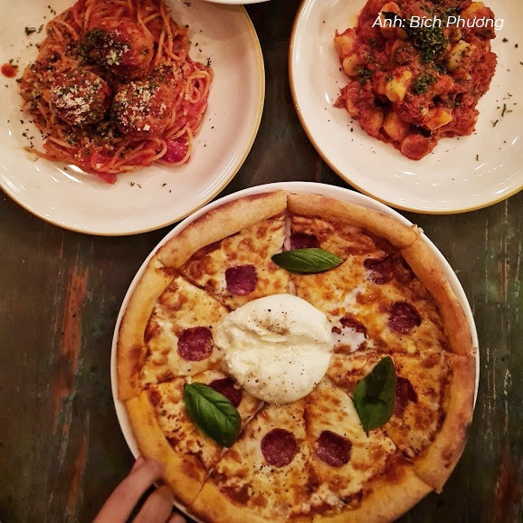 Các món ăn tại đây đều được chính tay đầu bếp người Italy chế biến, bày trí tỉ mỉ. Bữa tối tại nhà gần nhất, tôi đặt smoke salmon salad (salad cá ngừ xông khói), khoai tây chiên phủ phô mai Parmigiano lá hương thảo, Australian steak BBQ ăn kèm bánh mì pita cho 3 người ăn. Vì vận chuyển từ Thảo Điền đến nhà tôi khoảng 7 km, quãng đường khá xa nên phần khoai tây hơi mềm, nhưng hương vị vẫn đảm bảo. Phần ăn tôi đặt được áp dụng chương trình khuyến mãi tặng thêm phần pizza margherita.
