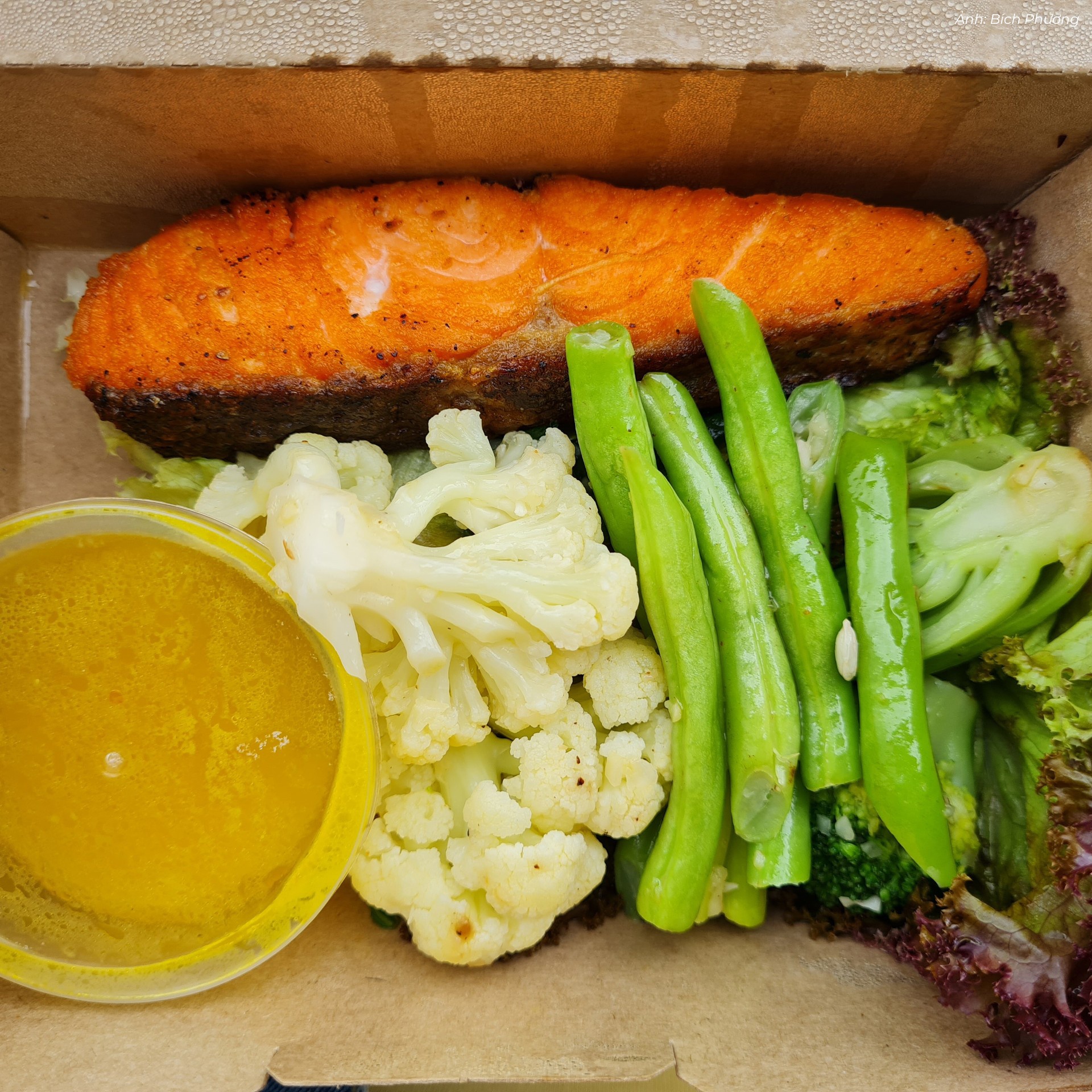 Tôi từng đặt phần ăn trưa tại nhà hàng này gồm món cá hồi áp chảo sốt bơ chanh, hạt chia nấu sữa với trái cây tươi. 2 phần ăn đáp ứng được tiêu chí nhanh gọn, đủ dinh dưỡng cho bữa trưa của tôi. Món chính có phần cá hồi ngọt thịt, quyện sốt bơ chanh ngậy, thơm, át đi vị tanh của cá. Phần ăn được xếp gọn gàng trong hộp giấy, sốt cũng được để riêng, rau xanh gồm súp lơ, cải ngọt, xà lách, đậu đũa được cắt tỉa gọn gàng, không dập nát. Phần ăn nóng hổi khiến hộp đựng đọng hơi nước trong quá trình vận chuyển nhưng không ảnh hưởng đến hương vị món ăn.