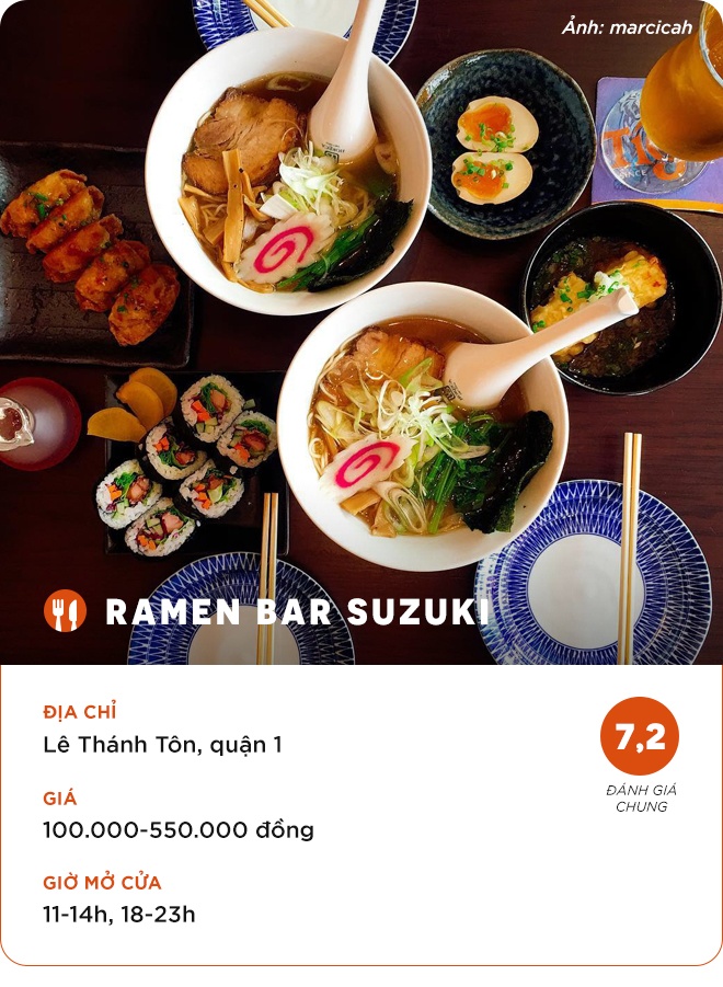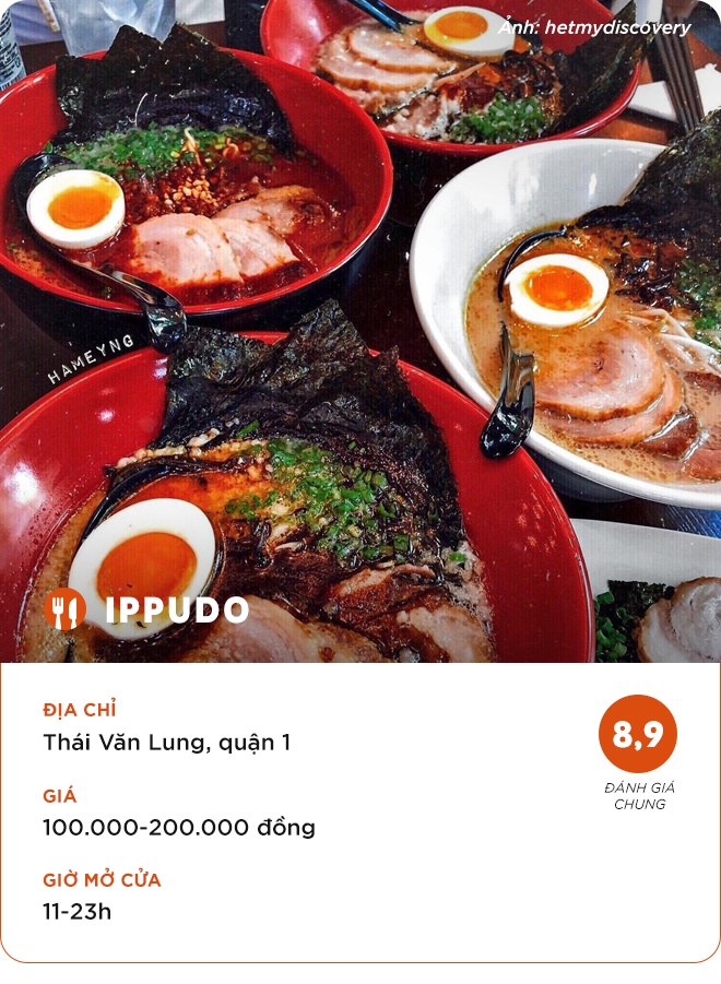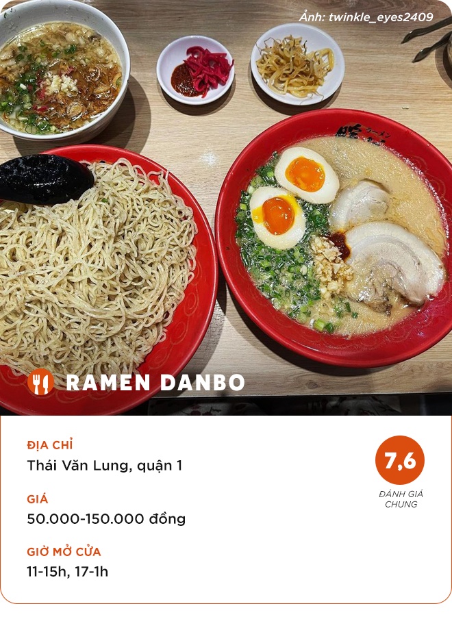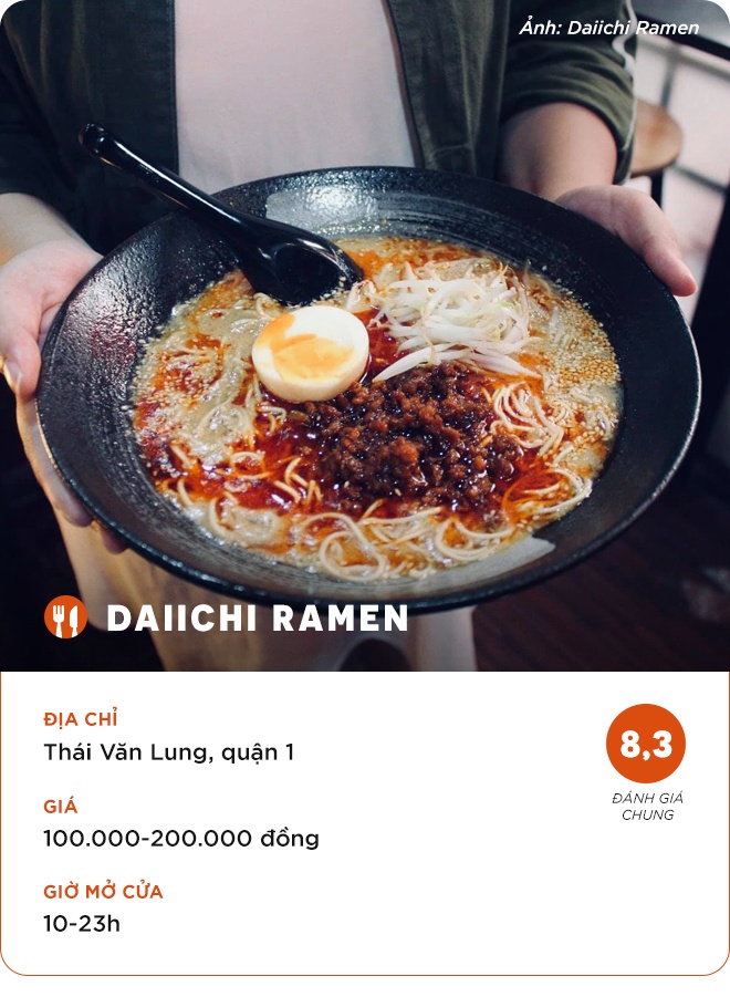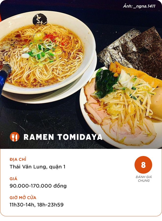 Duc Anh Hoang: "Quán mì ramen theo phong cách cao cấp. Menu khá nhiều món, chia làm 4-5 nhóm ramen. Mì được chọn theo mức độ cứng, mềm, trong tô có sẵn gừng đỏ, thịt mỏng, trứng lòng đào chuẩn".