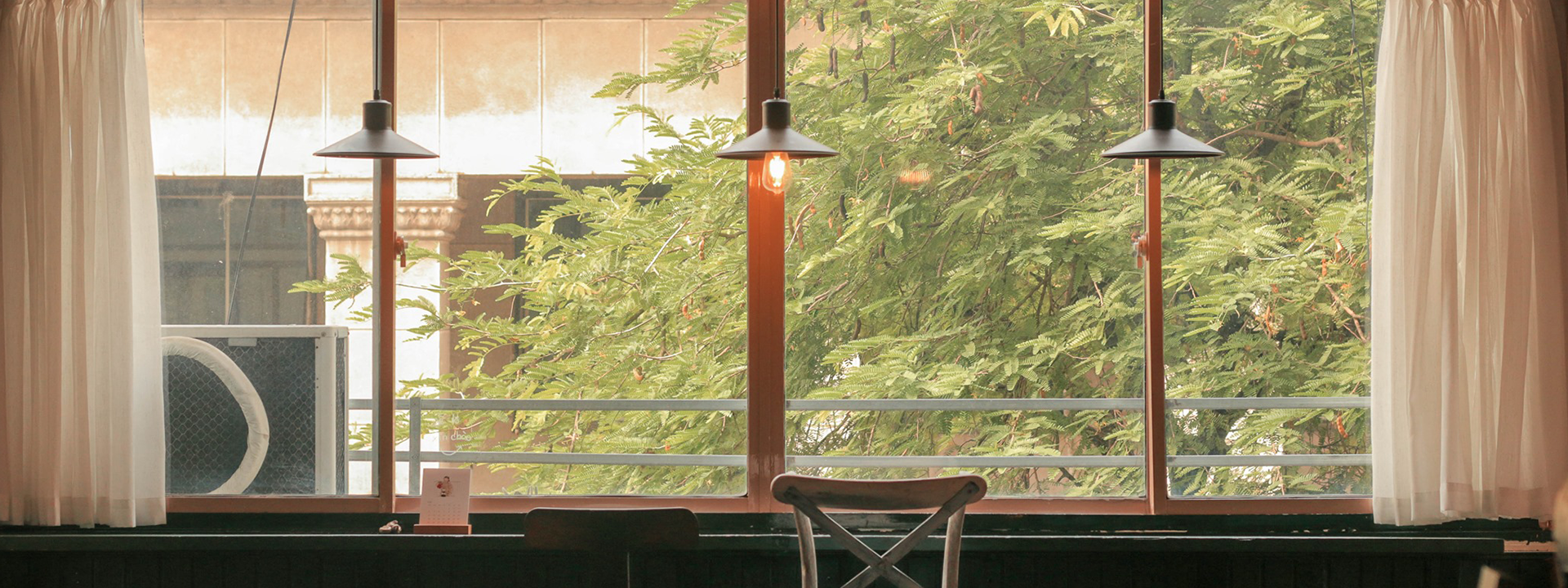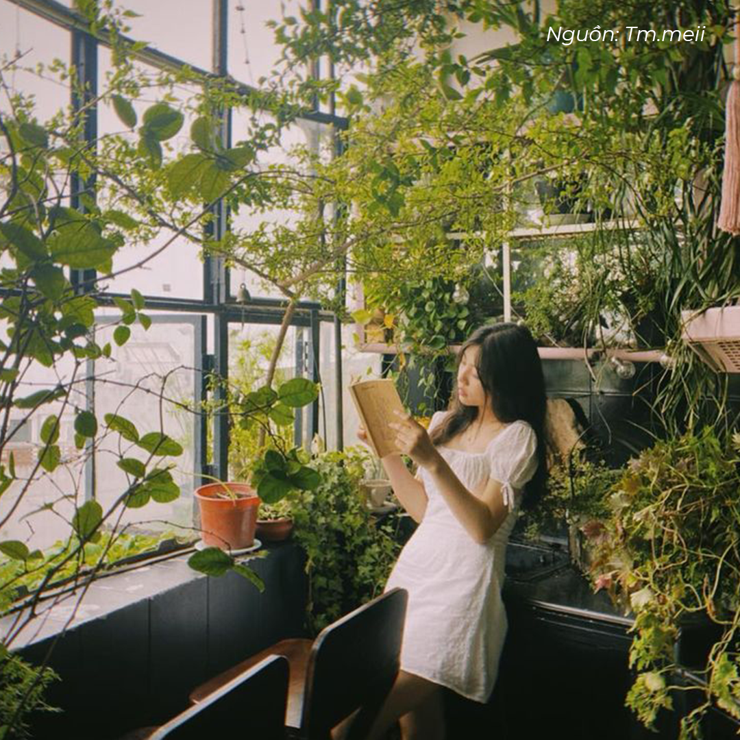 Không gian quán phần lớn là cây xanh và hoa cỏ tạo cảm giác như lạc vào khu rừng nhỏ giữa lòng thành phố. Tại đây, mọi người ngồi dưới sàn gỗ, bên cạnh là 2 khung cửa sổ to có view nhìn thẳng ra nhà thờ Huyện Sỹ.