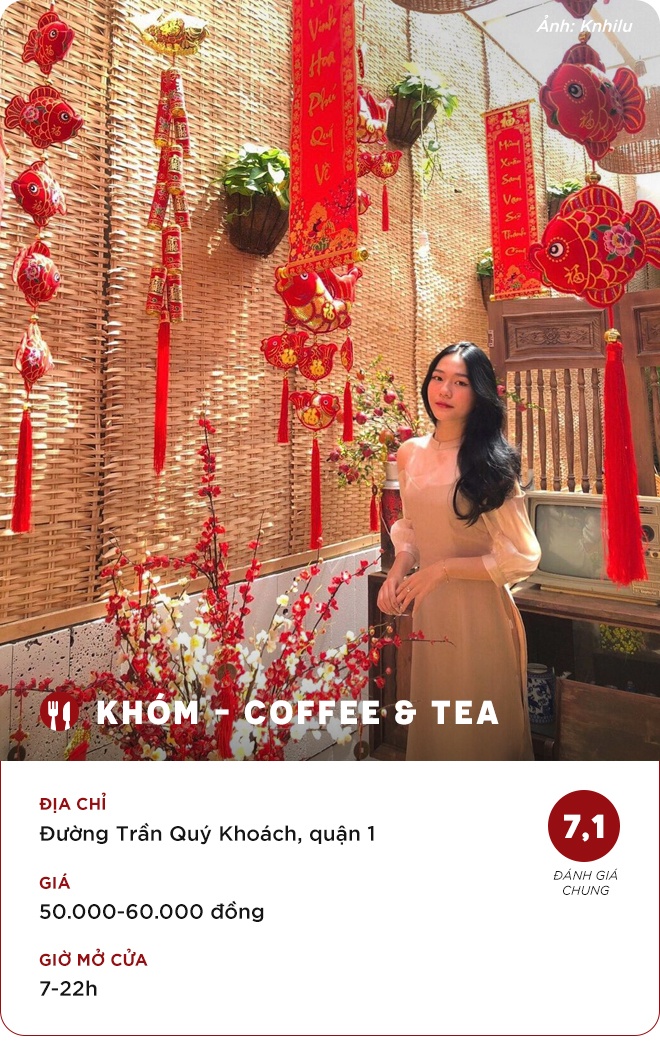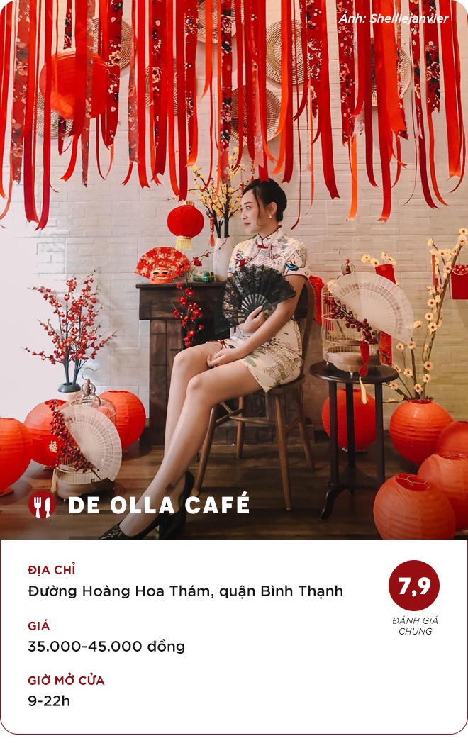 Hoàng Ánh: "Quán hiện tại đang trang trí theo phong cách Tết nên tông chủ đạo là màu vàng và đỏ. Các góc trang trí đẹp và xịn sò. Bạn nên cầm máy chụp hình đến chụp choẹt, tạo kiểu, lấy hình đăng ảnh ngày Tết. Chắc chụp cả ngày cũng chưa hết góc. Tôi có kêu đồ uống nhưng do đi với bạn, mải sống ảo nên quên chụp ly nước, quên luôn giá".