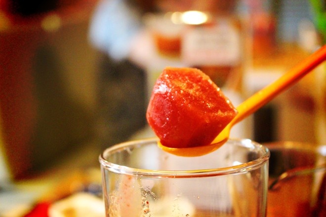 | Trong đó, sinh tố viên là sự kết hợp giữa các loại nước trái cây tươi, sữa chua được "phơi" trong thời gian nhất định ở phòng lạnh, rồi đông thành đá. Những viên đá màu sắc này giúp món nước ép của bạn mát lạnh và thơm ngon, đậm đà. Ảnh: Huỳnh Hằng. |