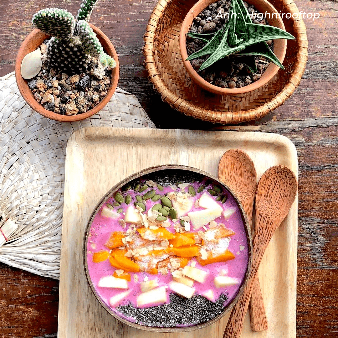 Tôi chọn một phần smoothie bowl có tên dragon fruit với giá 70.000 đồng. Điểm nhấn của món là màu sắc bắt mắt. Bên cạnh vị thanh long đỏ, nó còn xen lẫn vị của chuối, hạt điều, hạt bí, hạnh nhân… Bạn tôi thưởng thức tropical smoothie bowl có giá 75.000 đồng. Vẻ ngoài của món này không sinh động như phần của tôi, nhưng vị ổn.