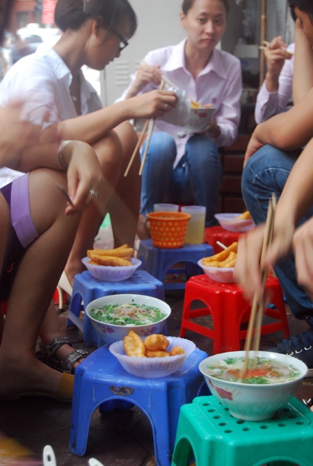 | Đến đây, bạn đừng mong một chiếc bàn hay cái ghế cao cao để đặt bát phở lên, đủng đỉnh dùng thìa với đũa nhẩn nha thưởng thức. Tô phở nóng bỏng tay thì khách vẫn phải bưng. Một tay lót giấy bưng bát, một tay cầm đũa, khỏi cần thìa, nước canh thì húp xì xụp. Đó chính xác là phong cách "phở bưng" đúng điệu Hà thành, vất vả nhưng vẫn ngon miệng lạ kỳ. |
